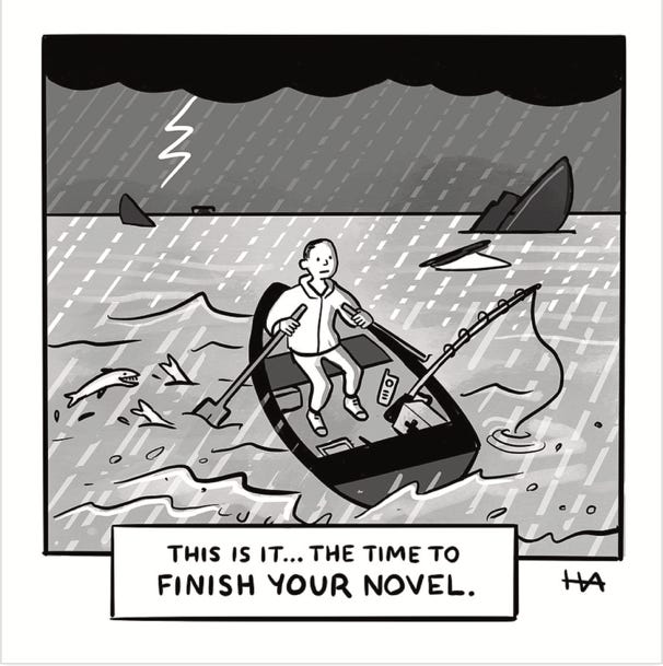 Stuck in a storm of incessant buzzing, Alison’s drawing helped me see that I’d turned into our friend in the rowboat, reaching for fillers that would make me feel productive to distract myself from the obvious fact that I had no control over external chaos. For a second there, the absurdity of it made me smile and I felt less alone.